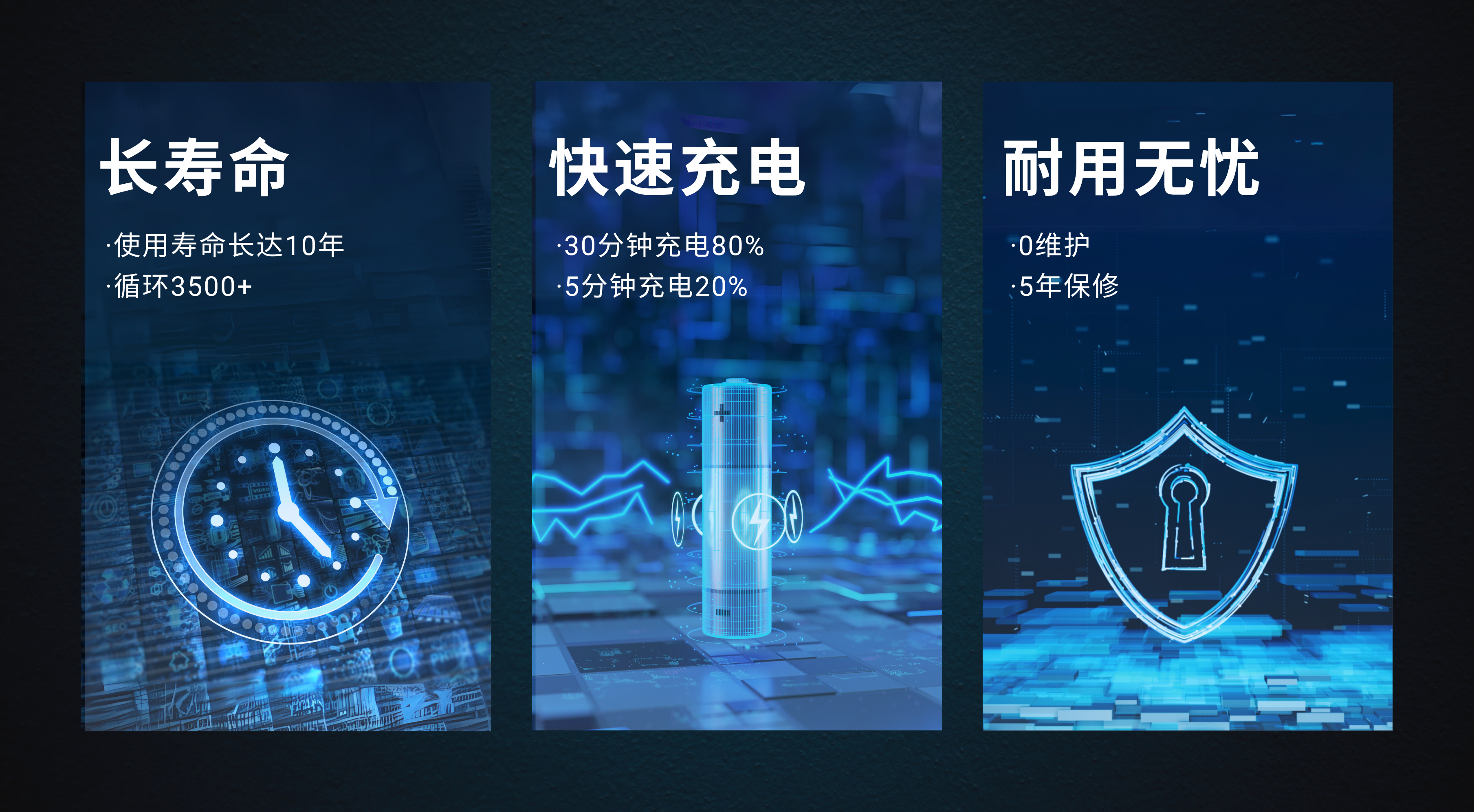 5年保质期,10年使用寿命,3500+周循环,智能BMS,免维护。