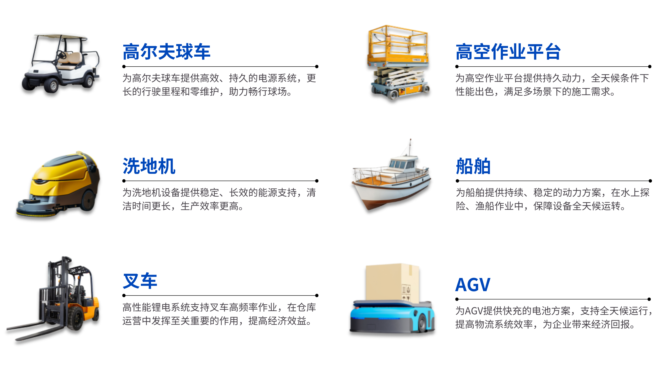 锂电替代铅酸解决方案广泛应用于高尔夫球车、高空作业平台、电动叉车、洗地机、船舶等领域,从铅酸升级为锂电池带来更优质的体验,同时提高经济效益。